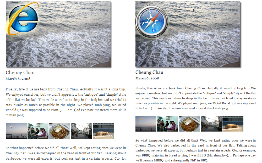 Btw, it's time that I explain to the vast majority of my visitors why I'm using the new font and style in K&C since Nov 2007. Click the pix below and you'll know why. While Safari displays my new font style so beautifully, IE/windows-based firefox completely ruin it. Any remedy? As far as I know, there're two. Windows version of Safari 3 should display web pages exactly like what you see on a mac. Or, well, why not switch to a Mac directly?